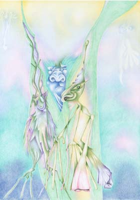 März 2000, Originalgröße DIN A3, Bildpaar mit "Kinderbaum" Auf einem Spaziergang spürte ich plötzlich die große Traurigkeit eines Baumwesens, welches durch Fällen seines Baumes den Kontakt zur Erde verloren hatte. Übrig war nur noch der Teil des Baumes, der durch einen Zaun gewachsen war. Da aber das Bewusstsein eines Baumwesens an seinen Baum gebunden ist, konnte es nicht gehen und auch keine neue Aufgabe übernehmen. Deshalb entstand dieses Heilbild, welches dem Wesen half das Reststück zu verlas-sen und wieder frei zu sein. |