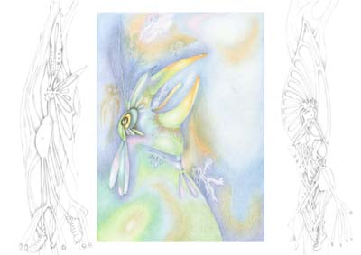 Dezember 1999, Originalgröße DIN A2 Zu diesem Bild inspirierte mich der Vogelpark in Singapur. Der Papagei stellt hier eine Verbindung zwischen Himmel und Erde dar und ist auch Ausdruck eines inneren Aufschreis, eines Schrei in den Himmel. Die Figuren direkt um den Papagei entstanden erst beim Malen durch "nicht zeichnen", das heißt durch freilassen der Fläche. |