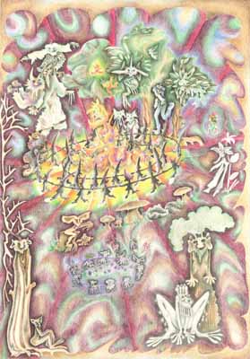 Oktober 1998, Originalgröße DIN A 2 Das Fest der Zwerge zeigt feiernde Naturwesen bei einem indianischen Schwitzhüttenritual. Während dieser Zeremonie im Garten einer befreundeten Künstlerin in Rösrath wurden diese Naturgeister mit einbezogen und bekamen an kleinen Tischen Schnaps und Gummibärchen serviert. Wie zu sehen feierten die Naturwesen mit, wobei von ihnen eine große Freude spürbar war. |
